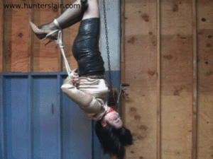 Petite blond Destine sits on a table top tightly bound and gagged. Chains hang from a pulley and are attached to her elbows and ankles. She struggle hopelessly on the table as the Hunter comes in. She screams into her gag as he pulls down on the chain hoisting her into the air. He hooks the chain secure and pulls the table out from under her. He toys with her spinning her around and swinging her in the chains. Then he produces a riding crop and starts beating her spandex covered ass. Destiny yelps into her gag with each swat but there is no way for her to avoid the blows.