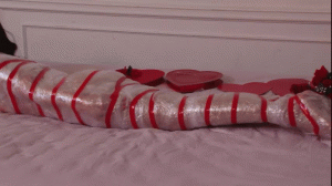Kitchen wrap, saran wrap, plastic wrap, transparent wrap, cling wrap, pvc tape, electrician's tape, red tape, tape gag, tapegagged, mummification, mummified, mummy bondage, mummy, bare breasts, topless, nice tits, barefoot, bare feet, brunette, cute, petite.