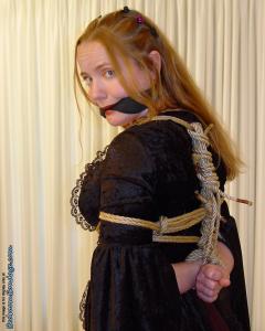 Long side 1024pixel JPGs in a zip file. French maid, uniform, costume, high heels, hose, hosiery, pantyhose, fully clothed, topless, outdoors, outside, patio, tape gag, tapegagged, rope bondage, purple rope, dirndl, blonde, nice tits, big tits, busty. Added April 14.
