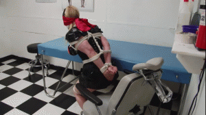 Nurse Boobie has been left completely tied up! Blindfolded and helpless, she works her way around the room searching for an exit. She hears voices in the corridor, and mmphs hopefully, but no one comes to rescue her. - - Black shiny nurse's uniform and cap, topless with red bra pulled aside, black satin patterned corset, barefoot with red toenail polish, dirty soles, red satin blindfold over red satin sleepmask. white duct tape gag, white nylon rope tied tight, crinkly noises from the shiny uniform when she struggles, big tits, busty, buxom, blonde, curvy, bare legs, struggling, clinic, exam room, medical, nurse costume, nurse uniform, fetish wear, shiny wear, hip corset, damsel in distress, live sound. (10 minutes.)