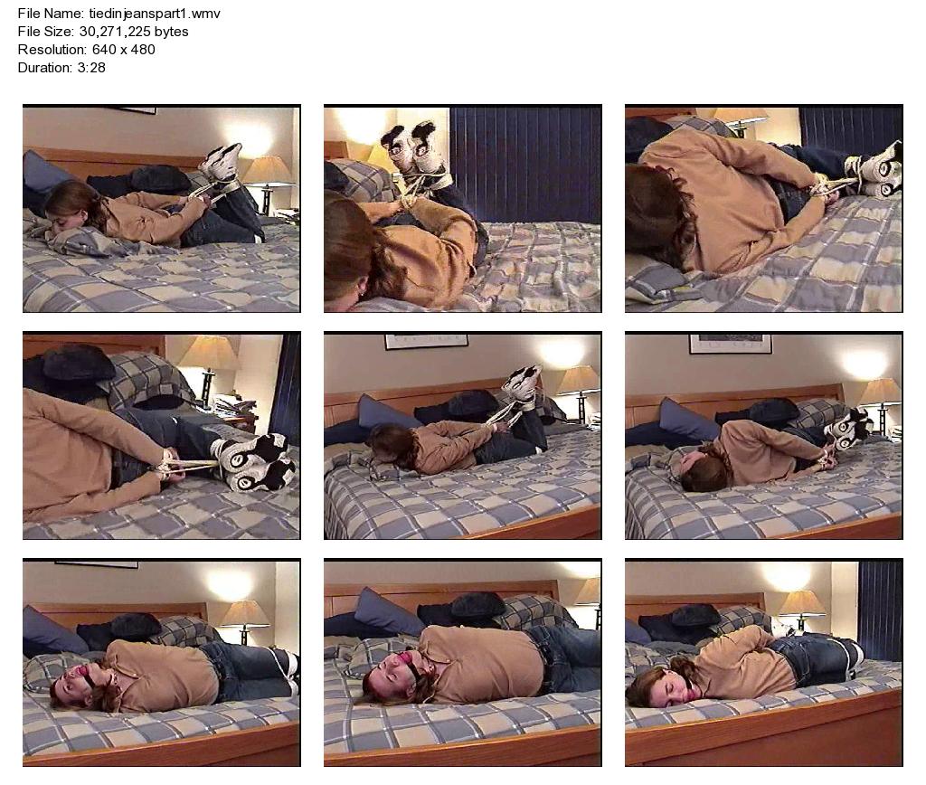 We had just gotten back from our favorite sports bar when Johnny judges that I really need to be tied and gagged. I think he is a little disappointed that his team didn't win, and tying adorable little Jackie up will really improve his mood. Hey! I'm game! I willingly head to the bedroom in my tan collared shirt, jeans belted at the waist, and sneakers. When we get there, Johnny takes a moment in the closet pulling out the implements he needs. Then, I sit patiently as he uses white rope to tie me into a dashing hog tie that is perfect for rolling around. He places a red ball gag in my mouth and goes to the kitchen. When he returns, he is delighted when he finds me tossing back and forth on the bed eagerly. Now, the game doesn't seem so bad!