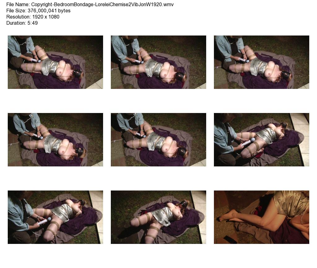 This is Part 2 of 2 in the Pastel Camisole sequence. It is now very late, and Lorelei is down to just her pastel camisole on this November night. She has been roped into a tight frogtie, is thoroughly tape-gagged, and is now sightless due to a secure leather blindfold. Her captor wields a large vibrator over her mons area. Lorelei alternates between bouts of fretful struggling, and accepting her unavoidable fate. She eventually succumbs to orgasm. ("Captor": Lorelei's boyfriend Jon Woods.) Uploaded February 8.