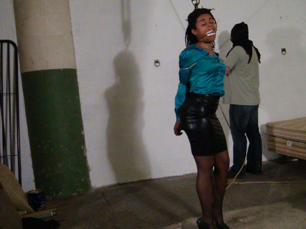 Sexy accounant Je C was keeping the books for the nefarious crime lord and skimming thousands of dollars for herself. She figured that they were too stupid to figure it out. But she was wrong and then sent an enforcer to her office to punish her. He tied her up brutally tight with thin wire and brought her back to the old warehouse. He pushed her along in front of her and stopped directly under a block and tackle. Her mouth was packed tight with rags and another wire was tied around her throat as a XXXX. He pulled the hook down to the wire XXXX and hooked the end of the wire to it. He then pulled the rope attached to the block and Je C was XXXX up onto her toes to keep from choking on the XXXX. The thin wire around her arms cut painfully into her flesh and the thin silk fabric of her blouse provided no protection from the brutally tight wire. He told her that she was going to earn back all the money she had stole by being a sex slave. He then pulled her long pencil skirt down around her ankles and XXXX her to step out of it. He pulled her stockings down and pulled off her stiletto high heels. She stood there on her barefeet on her tiptoes to keep from choking on the wire as he XXXX her to step into a pair of white stiletto heel whore boots. Then he ordered her to step into a tiny blue mini skirt and he pulled it up to her waist. Then to her releif he started to untied the wire around her arms and freed her hands. He XXXX her to then remove her expensive silk blouse and bra. Je C stood there with her neck still tightly tethered in the wire XXXX topless wearing white stiletto boots and a skimpy blue mini skirt that barely cover her ample ass. She instictively reached down and tried to pulls the short skirt down to cover her ass cheeks and then reached up to the wire XXXX to try to releive some of the pressure from her throat. But he handed her a tiny spandex crop top and order her to put it on. After putting on the top he pulled her arms behind her back and to her relief tied her elbows and wrists tightly together with ropes. Once her arms were welded tightly together behind her back he finally released the block and tackle and removed the wire XXXX. He then marched his bound captive over to a chain link fence cage and locked her inside still tightly bound and gagged. Je C cried into her gag wanting to beg him to let her try to get the money back but he walked away leaving her bound and gagged inside the fence........Hours later Je C heard the thug return, she was sitting on the floor leaning against the wall half aXXXX. He had a cup with water and he removed her gag and offered it to her. Je C. begged him to please let her go, she would get the money back somehow. But he wasn't interested, he told her to drink because it would be a while before she could get any more. Je C. sipped on the straw, the water felt good. Then he pulled the cup away and with her still pleading and begging he stuffed a huge red ball gag between her teeth. Je C's jaw ached from being stretched open by the huge ball. He strapped it tightly in place around the back of her neck. She watched as he left the caged cell and noticed that he didn't fully lock the padlock this time. After he was gone she struggled to her feet and went to the gate, her prayers were answered the padlock wasn't locked. She reached through the fence with her bound hands and got a hold of the lock. It took some effort with her bound numb hands but she managed to quietly remove the padlock from the chain. She then opened the gate and was free of the cell. But her arms were still helplessly and uselessly bound behind her back and the huge red ball gag XXXX her jaw painfully open. But there was no time to spare, she crept over to the main door and to her suprise and joy it wasn't locked. She opened the door and peeked outside, there was a long corridor outside, she wasn't sure what way to go and her could return at any minute so she crept along the wall trying not to make noise with the stiletto heeled boots. Around the next corner she peeked and saw a large red door at the end of the corridor marked fire exit. She had to get to that door and fast but if she ran her heels would echo off the wall giving away her escape attempt. She she moved as fast as she dared to the fire exit and tried to open it. But it seemed stuck and she pulled hard at the door so intent was she at trying to open the door she didn't hear her come up behind her. He grabbed her and she screamed into her gag in XXXX and frustration. He pulled her down the hall but Je C. dragged her heels and wouldn't come so he picked her up and tossed her over his shoulder and carried her back. Once back in the warehouse he attached her wrists the block and tackle and hoisted her arms up high behind her back. Her shoulders screamed in agony at being stretched and twisted. He left her hanging by her wrists in torment only to return to inform her that the boss has decided that getting the money back wasn't so important he would instead make an example of her. He then wrapped a rope around her throat and began to XXXX her. Je C. coughed and drooled past the ball gag as her windpipe was crushed by the rope. But the thug felt that he couldn't get a good bit around her throat with the rope with her hanging in the strappado so he cut her down and pushed her onto the bed.