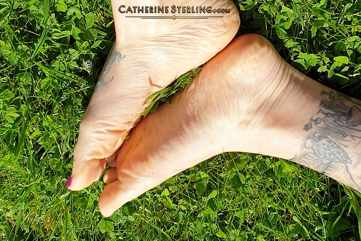 In this compilation filmed from a foot voyeur point of view, you see stripped bare toe nails on feet so close to you, you could almost bury your nose it those toe gaps to smell them, as the toes wiggle in your face! Next pearly polish shines as big toes are bound together, limiting the movement of my playful, tattooed feet, as my toes struggle on the bed sheets. Lastly, out in the open for all to see, my flirtatious feet find foliage to play with, gripping grass in-between scrunched toes, and showing you wrinkled soles as I roll in the clover, on the daisy sprinkled lawn. You can’t keep your eyes off my pretty, purple pedicured bare feet.