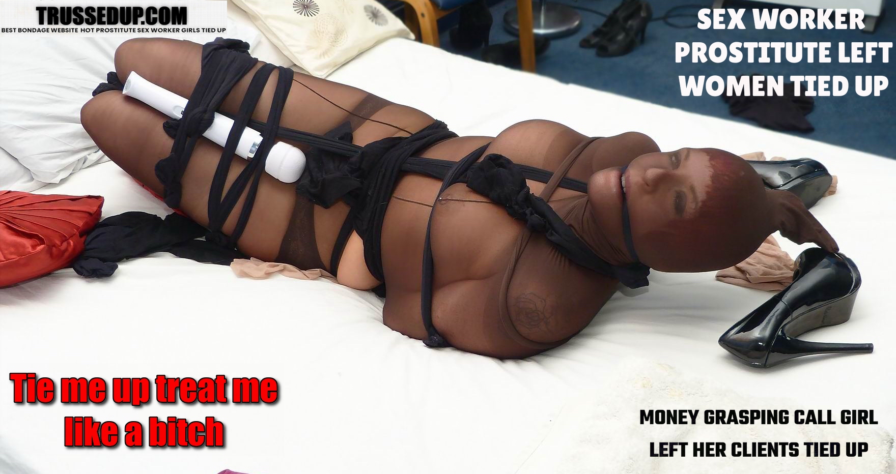 Frustrated desperate housewife Imogen paid a lesbian sex worker to tie her up and tease her full nylon pantyhose enclosure she was tied up and gagged with nylon stockings and teased with a magic wand the hustler left the nympho struggling to orgasm using the magic wand on her pussy lesbian bondage