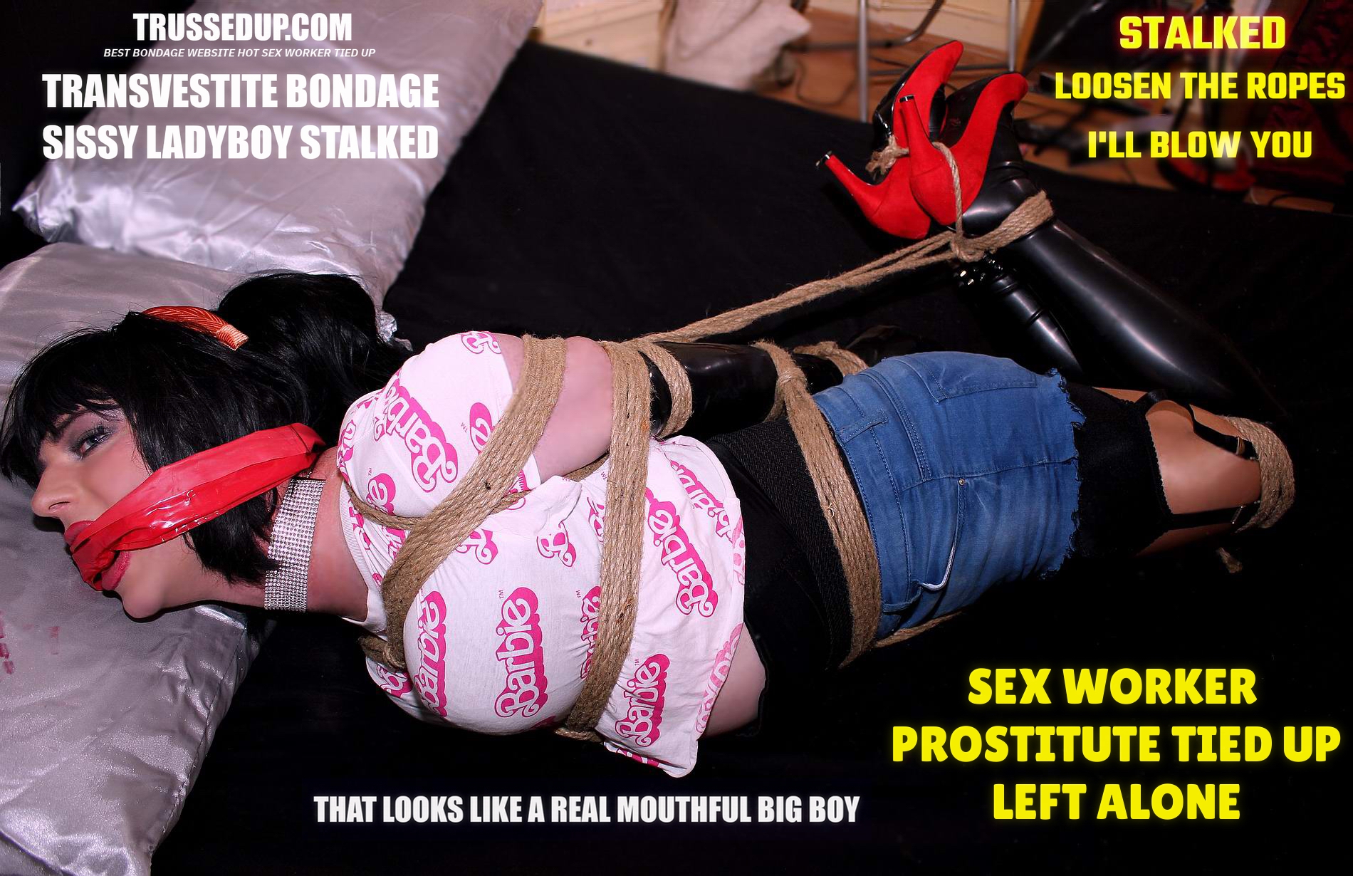 tight inescapable hemp rope slut trans sex worker stalked hogtied hand over mouth brutally tied up transvestite prostitute in her cut down jeans and rubber thigh high boots hot trans ladyboy bound and gagged for sex with pervs barbie doll in rubber thigh high boots giving head to her clients mobile friendly transvestite bondage video free sample