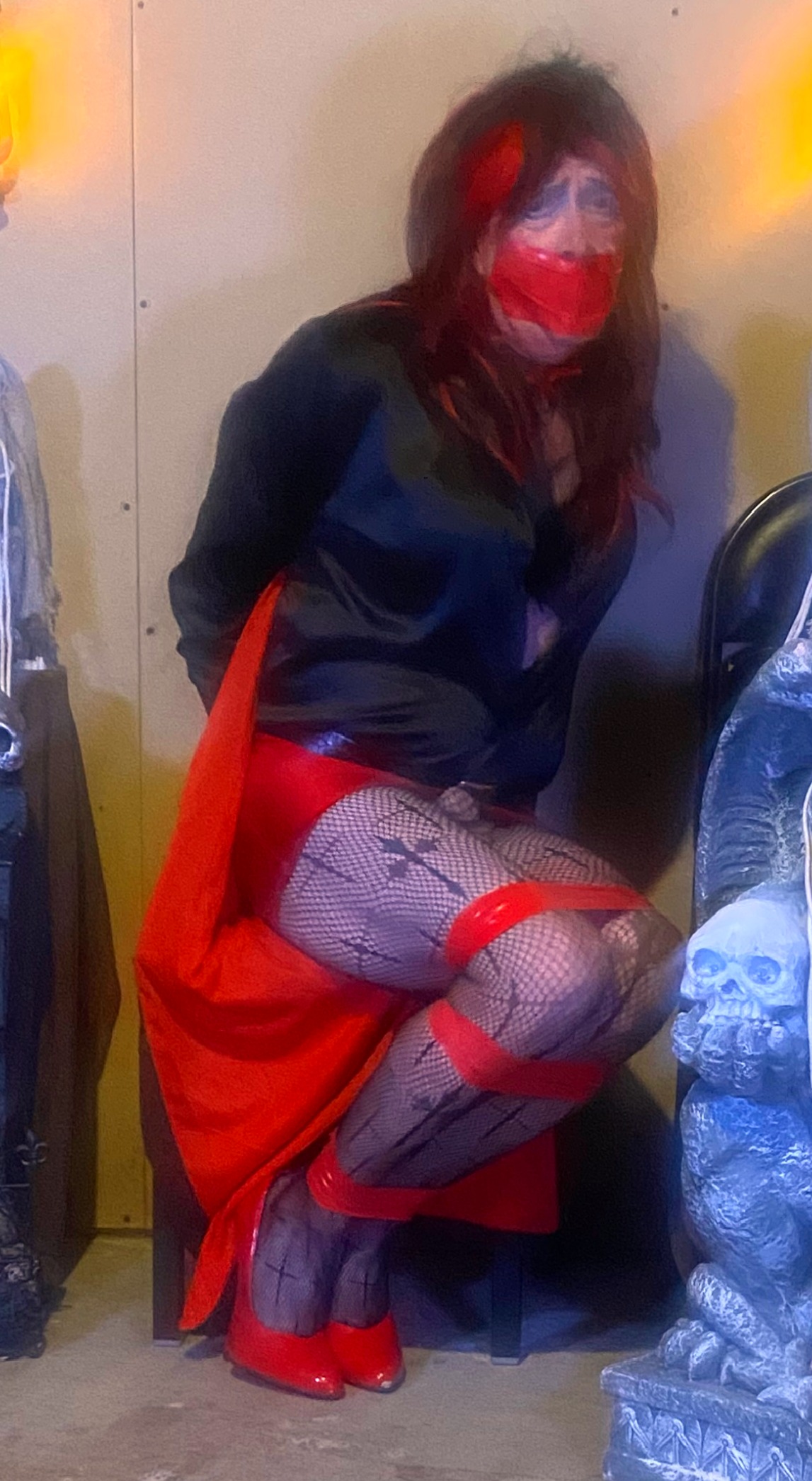 A brand new Halloween Hostage character and scene. Filmed and photographed one month ago, in September, 2025. A two Part Halloween Hostage scene, which I had never done before. I was torn on what the next Hallowen Hostage would be. Dracula has always been one of my favorites. So, here is my version of Dracula, transformed into a trans Dracula, effectionately named Dragula. Sorry! I just couldn't resist. Anyways, here we have Dragula, in a setting complete with eery lit lanterns, strange headstones, gargoyles, and very spooky lighting. Dragula dressed in 5 " ankle boots, dark religion cross fishnets. Short skirt, silk blouse, cape, gloves, fangs, and duel red and black hair. Sitting on a chair, first only with hands tied behind back. But soon tape gagged, and then finished off with her legs taped in 3 places. As the spooky and eery sounds of Halloween dominate her mind.
