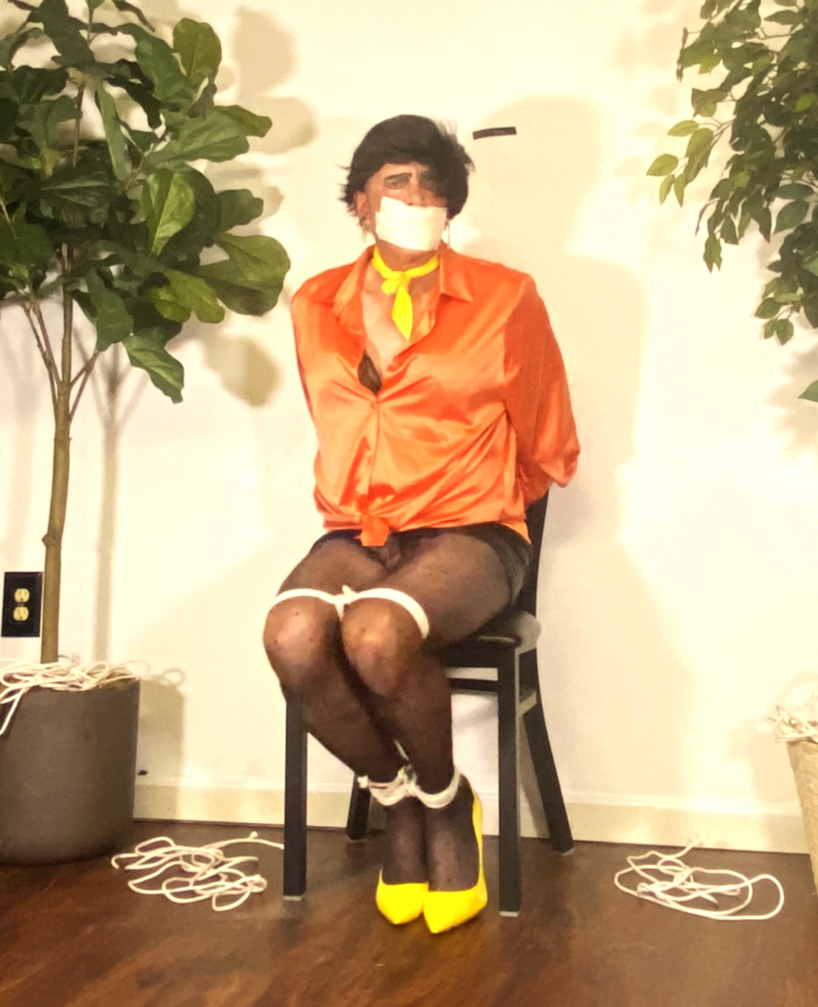 This is the debut of a brand new Series on Transformed By Bondage, "Portraits In Bondage". A series involving me wearing outfits and attire combinations that I have never before worn. And this Series focuses on sexy, sensual, and erotic struggles, bound and gagged, always in the same setting and location. In this first installment of "Portraits In Bondage", I play the role of a captured and captive Fashion Designer. Evident by my attire, whcih was inspired by a Japanese Damsel video that I watched and viewed several times. The rare combination of 5" yellow high heeled pumps and the orange silk blouse sets this outfit apart from most. One that only a Fashion Designer would wear. Add in black polka dot designer pantyhose, black leather mini skirt, yellow neck scarf to match the high heels, and short pixie cut hair style, and you have "The Fashion Designer".