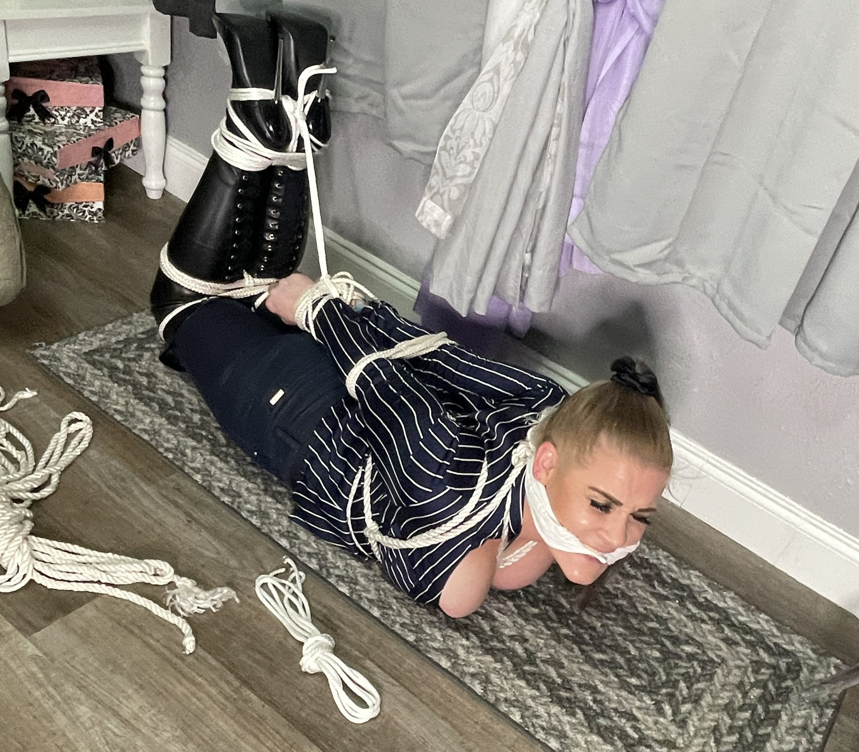 Includes: bondage, bound, tied, DiD, gagged, cleave gag, otm gag, over the mouth gag, rope bondage, rope bound, leather boots, tight jeans, busty, big tits, escape challenge, arched boots, stiletto boots.