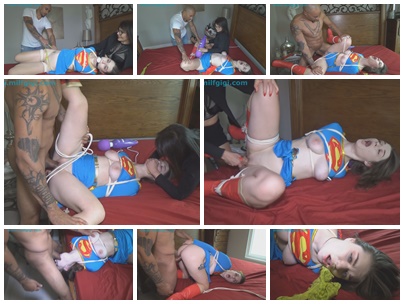 Supergirl ( Anastasia Rose ) arrived at the villains' hideout and she walks around checking the place out when suddenly me and my henchman King Noire arrive Supergirl turns hands on hips and says "I'm taking you down!" I press a button on a remote that causes a high pitched sound undetectable to human ears but very effective on superheroines. She drops to her knees holding her head in pain. I nod at my henchman who pulls Supergirl up to her feet and grabs her in a bearhug. Super girl cries out and fights as he squeezes her but soon she is XXXX. King lifts her over his shoulder and carries her to a bedroom. Supergirl awakens to find she's ballgagged and all roped up - her arms are bound behind her back and her legs are in a tight frogtie. She struggles but is surprised to find she can't break free I walk in and admire the young ripe body of the trapped heroine. I pull up her top and suck her tits then call King in to tear off her panties. I grab my huge super vibrator and press it up against Supergirl's pussy. She protests but can do nothing. I start to finger Supergirl's pussy sliding two fingers easily into her wet pussy. I force her to suck my fingers tasting her own pussy. I combine the magic wand with my fingers until the pretty thing cums hard. I lift my skirt exposing my strap-on and her big blue eyes widen in terror. I slide slowly and deeply in Supergirl's wet pussy. I bang her doggie style then King lifts her up onto my cock and I force her to ride my cock. After a while I pull out and fuck her pussy roughly with a thick dick on a stick to get her ready for my sidekick's big black cock. He returns and Supergirl finds herself being untied. The foolish super heroine thinks she's being rescued but suddenly finds her mouth stuffed with his cock. He face fucks the horrified heroine until she's gagging on his huge cock. He tires of this and lies her on her back holding a leg up in the air and he XXXX his cock deeply into her pussy. King fucks her with abandon then bends her over to forcefully fuck her from behind. I hold her face down while he fucks her brutally hard until her body betrays her and she cums long and hard. He pulls out and shoves his cock back in her face and cums all over her face and mouth. While the cum is still dripping off her beautiful face I bind her ankles and press the ballgag back into her mouth leaving her ready for the line of guys and girls waiting to fuck her ...